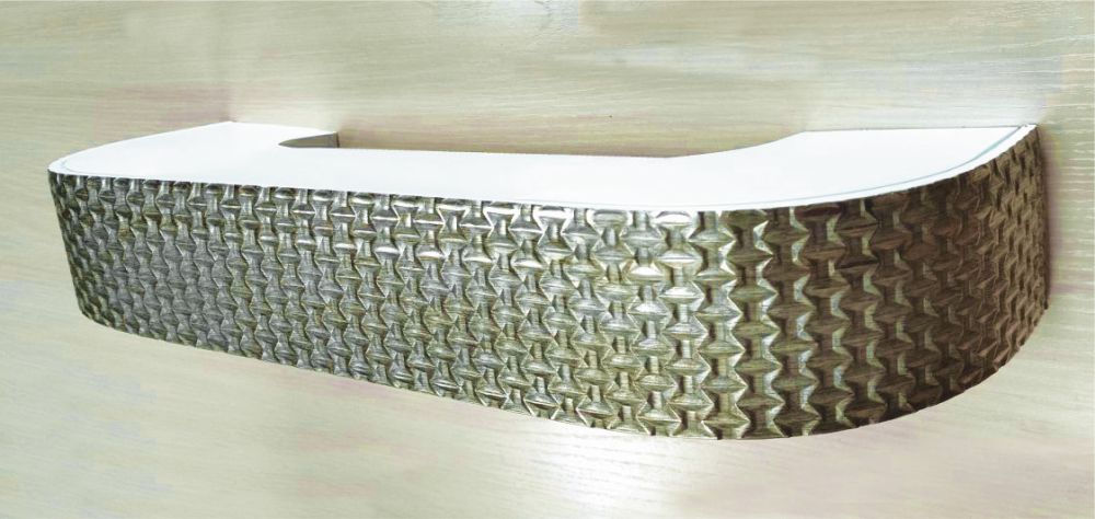 Элементы узора слегка объёмные, симметричные, что придаёт ему 3D эффект выпуклой текстуры. Металлические оттенки придают ему ауру роскоши и утонченности.